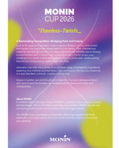 2026年、日仏貿易・MONIN(モナン)主催のカクテルコンペティション「MONIN Cup Japan 2026」が開催決定いたしました。27歳以下のプロフェッショナルバーテンダー及び飲食店従事者の方を対象に、アジアそして世界大会への切符をかけて技を競い合っていただきます。